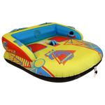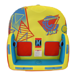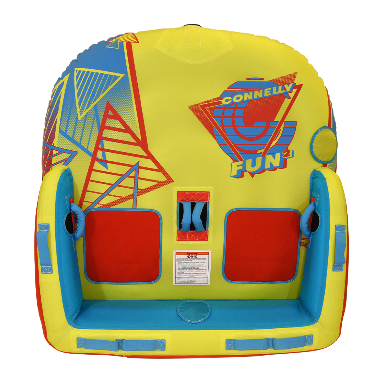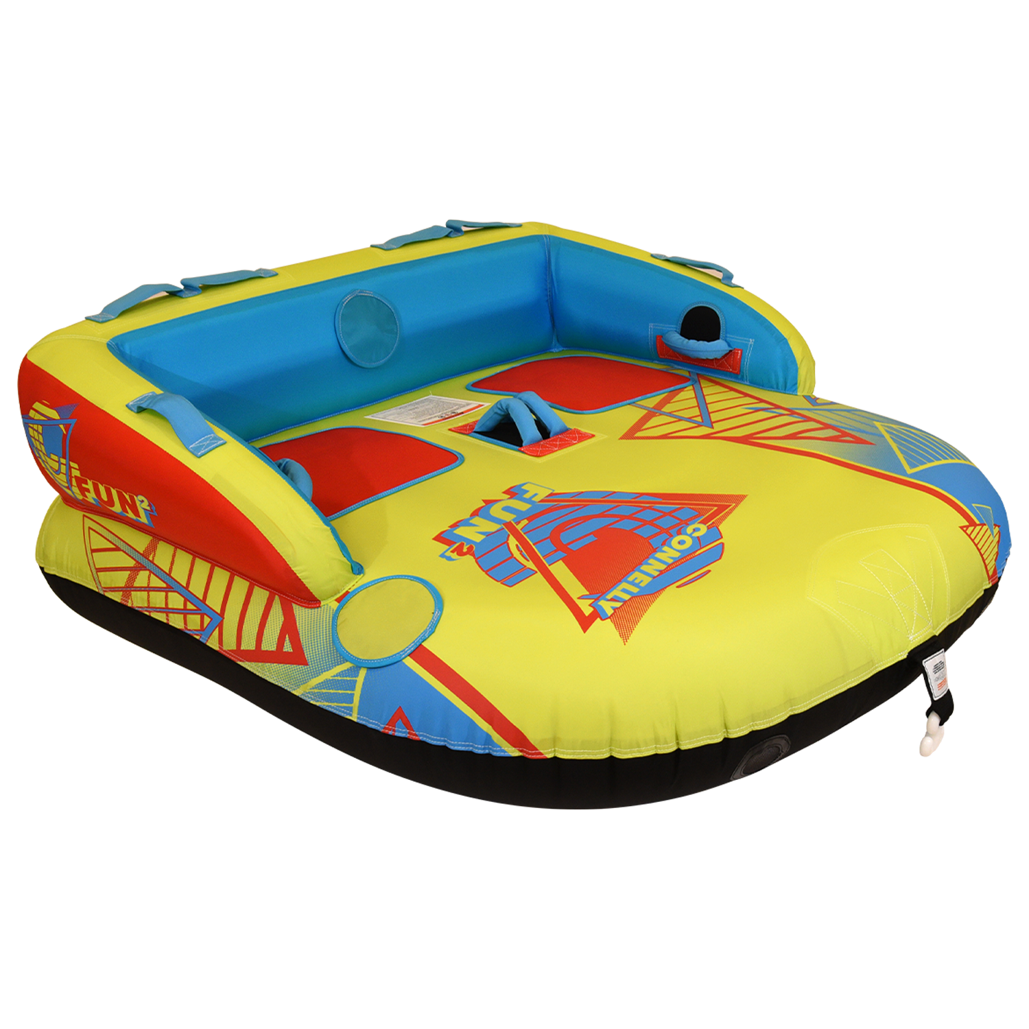 The Fun 2 towable tube is perfect for 2 riders, offering both laid-back couch or kneel chariot styles for action-packed fun. Measuring 65” x 65”, it features Two-Way Tow technology for versatility. Made from durable 420D nylon with a heavy-duty bladder, it includes soft EVA seats, padded handles, grab straps, quick inflation via Boston valve, and a mesh drain bottom. Comes with a repair kit and a 1-year warranty.