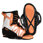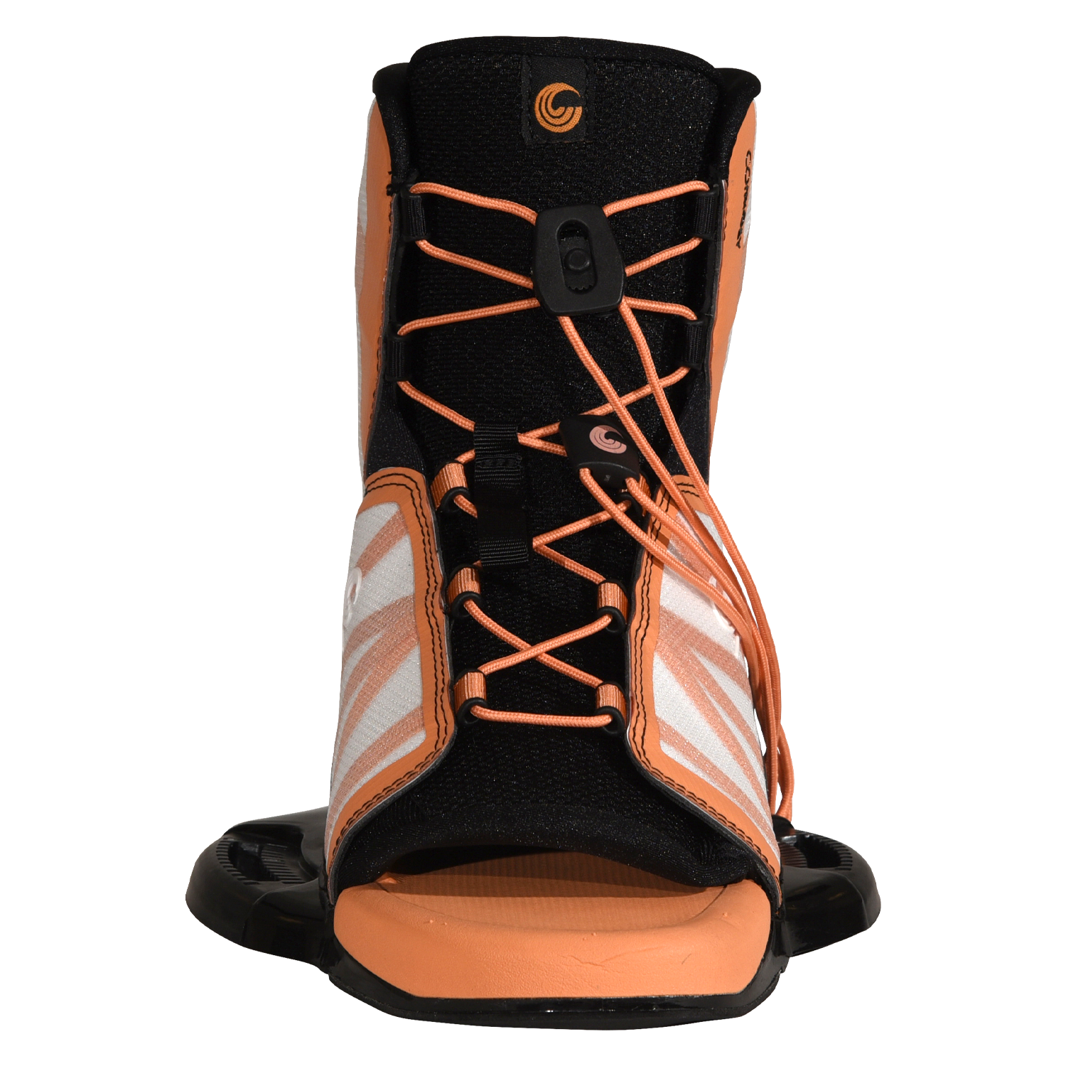 The latest Connelly Karma Wakeboard Binding features a new one-piece 3D molded tongue for enhanced comfort and support. Designed to fit a variety of foot sizes, its adjustable single lace cinches into an ergonomic heel pocket for pro-level response. Equipped with the industry's strongest Infinity Plate chassis and a cush EVA footbed, it offers durability, lightweight performance, and impact protection.